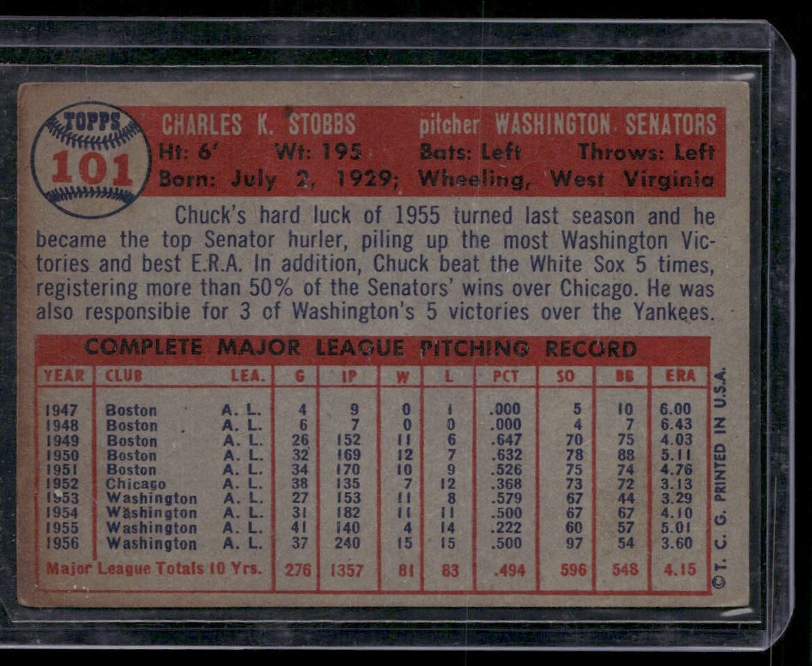 The 1957 Topps Baseball Charles K. Stobbs #101 card is a must-have for avid collectors and vintage sports enthusiasts. This highly sought-after card is part of the iconic 1957 Topps set that revolutionized the baseball card industry with its clean design and updated format.