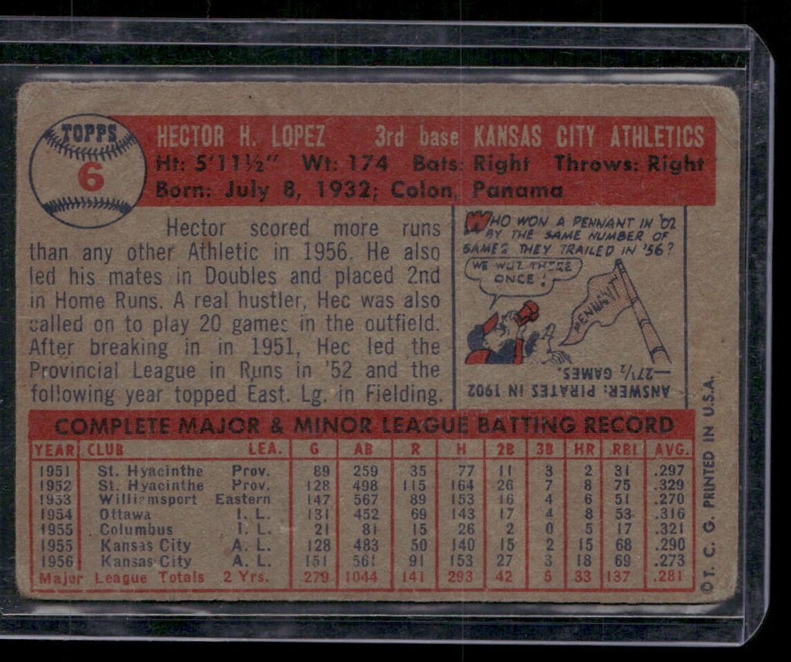 Step back into the golden age of baseball with the 1957 Topps Hector H. Lopez #6 card. A true gem for collectors, this card features a beautifully preserved design that captures the essence of the era. The classic Topps layout and Hector Lopez’s iconic moment make this a must-have addition for avid baseball fans or nostalgic enthusiasts alike.