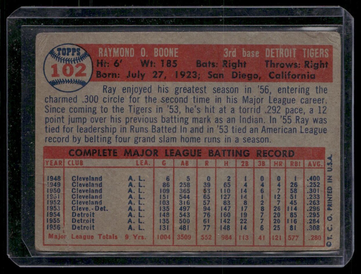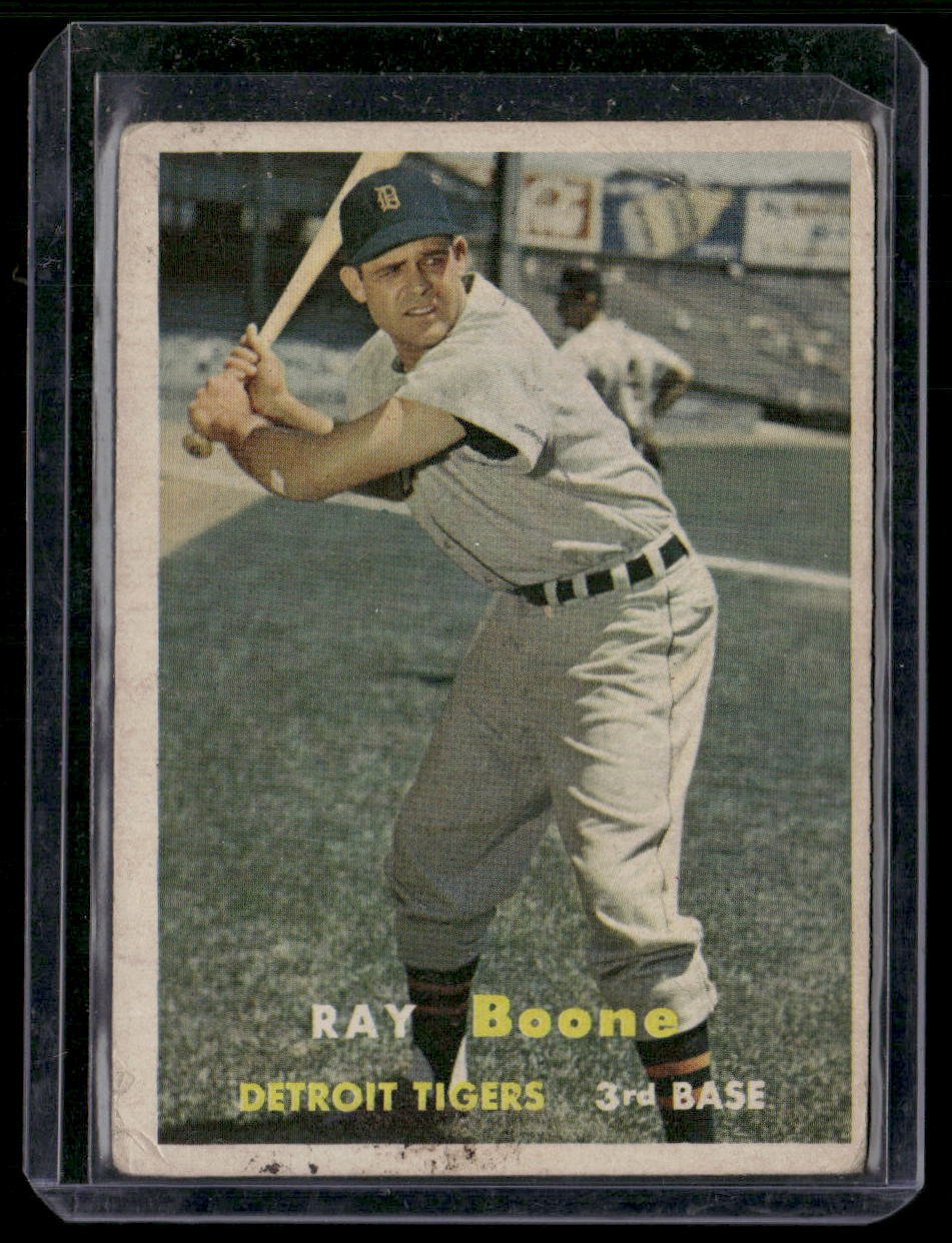 The 1957 Topps Baseball Raymond O. Boone #102 is a timeless piece of sports history. This card showcases the classic design of the ‘57 Topps series, making it a must-have for serious collectors and baseball enthusiasts alike.